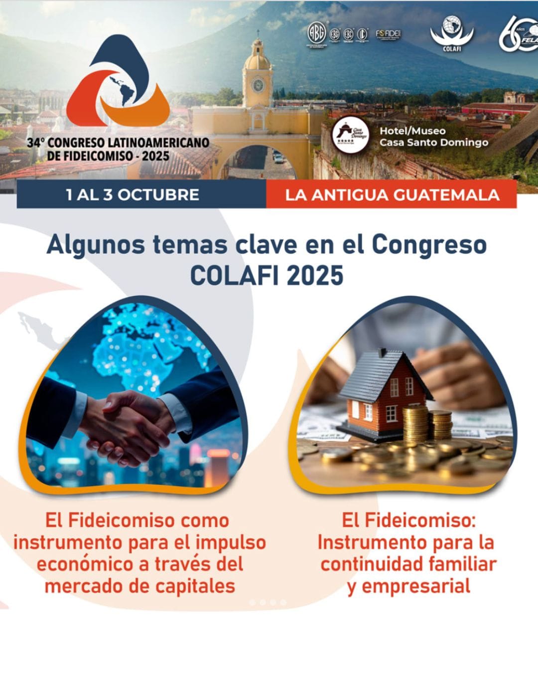 The Congreso COLAFI 2025, organized by the Asociación Bancaria de Guatemala (ABG) through the Escuela Bancaria de Guatemala (EBG) and the Escuela Bancaria Centroamericana (EBC), together with the Federación Latinoamericana de Bancos (FELABAN), will take place from October 1 to 3, 2025, at the Hotel Museo Casa Santo Domingo in Antigua Guatemala.